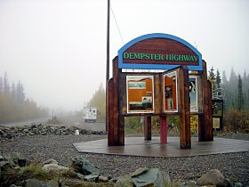Also weiter bis zum Dempster Corner. Am Abend zuvor war es noch sonnenklar am Km0 des Dempster, heute morgen lag alles im Nebel.