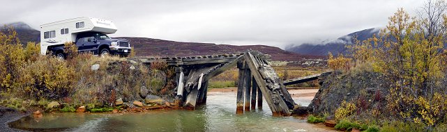 Am heutigen Tag das letzte Stück Strasse weiter nach Nordosten, soweit es ging: Nach der MacMillan Bridge No.4 ist die No.5 eingestürzt, dies aber schon auf N.W.T.-Grund.
