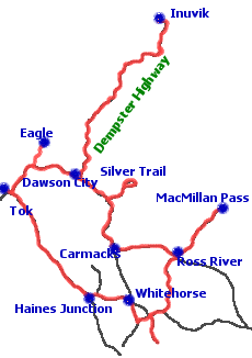 Alles wieder zurück und bei Dawson über den Yukon River. Top of the World Hw und Taylor Hw bis Eagle und von dort nach Tok am Alaska Hw.
