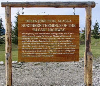 "This highway was constructed during World War II as a military supply route for interior Alaska Military and Airfields in 1942. 7 Army regiments and 42 Contractors and Public Roads Administrators working from Delta Junction South and Dawson Creek North completed it when they met at Soldiers' Summit at Kluane Lake Yukon Territory in November 1942. At the peak of construction, 77 Contractors employed 15,000 men and 11,000 pieces of road-building equipment. The total construction cost for 1422 miles was $115,000,000."