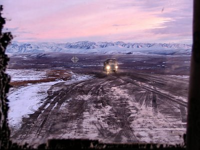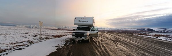 Einige Kilometer später dann die Entscheidung: An einer Ausbuchtung an der höchsten Stelle des Dalton machte ich Halt. Die Aussicht traumhaft in alle Richtungen. Mein Camper total verdreckt, konnte nicht einmal zu den Scheiben hinausschauen.