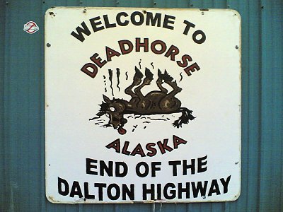 Nach weiteren 44 Meilen durch das arktische Flachland auf angenehm ausgebauter Strasse kamen die Ölförderanlagen in Sichtweite. Ausserdem grosses Gerät und Baracken (hier sagt man dazu Trailerhomes oder Hotels...). Die Grafik zeigt unverkennbar den Ortsnamen: Deadhorse.