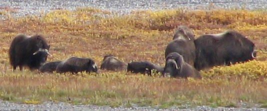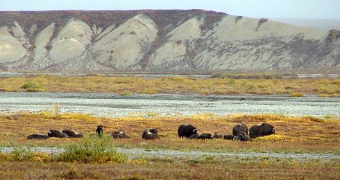 Am Ufer des Sagavanirktok River eine Herde Muscox (Moschusochsen oder Bisamochsen), typische Bewohner der Tundra.