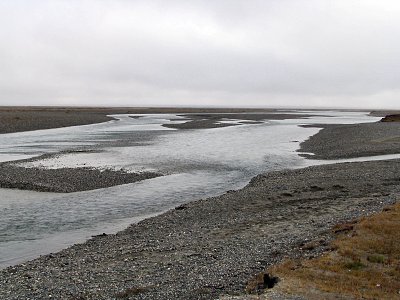 Hier ein Foto, auf dem man gut die Kargheit und Abgeschiedenheit hier oben im Norden ermessen kann. Am Ufer des Sagavanirktok River gibt es nur Geröll und weit und breit keinen Baum oder Strauch.