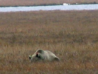 Unweit des Dalton machte sich ein Grizzly über etwas her. Ihm war der Fotograf egal, er genoss sein Caribou(?) (auf alle Fälle waren es keine Blaubeeren)...