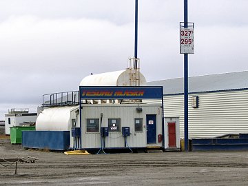 Die einzige öffentliche Tankstelle ist kreditkartenbetrieben. Keine Quittung. Hoher Preis, der daher rührt, das hier das "crude oil" in die Pipeline verbracht wird - und Diesel sowie Benzin zum Betrieb der Fahrzeuge wieder hier in den Norden über den Dalton gebracht wird.