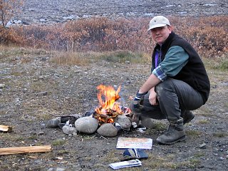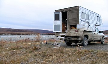 Eine kleine holprige Schotterstrasse führt zum Ufer des nur 200m neben des Dalton Highway verlaufenden Sagavarniktok River. Ein guter Blick über den Fluss, mein Hunger und die Ruhe versprachen einen angenehmen Abend.