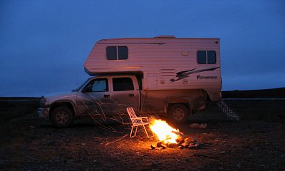 Mein Lagerplatz heute war wunderschön ruhig. Die vorbeifahrenden Trucks werden nach Einbruch der Dunkelheit immer seltener und dann ist tatsächlich nur noch das Prasseln des Lagerfeuers und das Gurgeln des Flusses zu hören. Sehr angenehm nach einem langen Tag im Diesel-Pickup.
