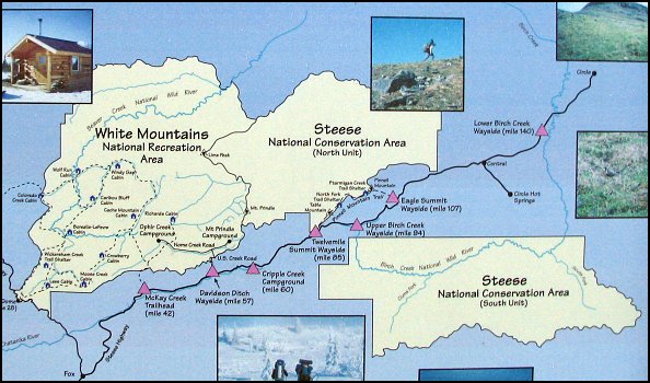 Auf der Karte sieht man, dass nördlich und südlich vom Steese Highway grosse Flächen zur Erholung dienen oder unter Schutz