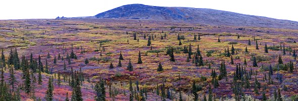 Die Bäume werden immer kleinwüchsiger, Taiga geht in Tundra über, Zwergsträucher, Weiden, Moose und rötliche Lachsbeeren öffnen den Blick auf die Hügel am Steese Highway.
