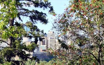 Durch die Stadt zieht sich der Saskatchewan River und bietet am Ufer viel Grün und gute Aussichten auf Downtown Edmonton.