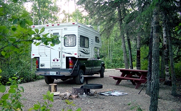 Der Platz selber Provinicial-Park-Standard: Feuerstelle, Tisch mit integrierter Bank. Hier im Norden